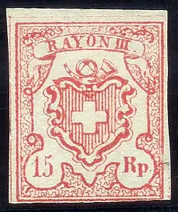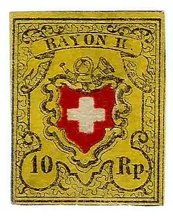 The local mail and rayon stamps of 1850 and 1852 constituted the first series of postage stamps issued by the Swiss Post. In philately, they are among the most sought-after Swiss stamps, with a 5 rappen Rayon I stamp selling for the record price of CHF 348,000 (USD 293,000) at auction in 2008.[1]