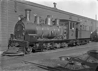 The first steam engines built in New Zealand were produced in 1872. Fraser and Tinne built an 0-4-0 in Auckland in 1872, but it was based on a Hornsby traction engine.[8] Similarly, a steam crane was converted during construction of the Port Chalmers railway,[9] though it could only haul about 10 tons.[10] The first locomotive entirely built in the country was a 10 hp (7.5 kW) engine for the Foxton Tramway contractor, Ashworth Crawshaw,[11] by R. S. Sparrow & Co in Dunedin,[12] also in 1872.[13] It was named Palmerston.[14] Horses had replaced Palmerston by 1874,[15] but, in 1875, after iron had replaced wooden rails, the same branch had an A class steam locomotive built in Wellington by E.W. Mills' Lion Foundry.[16]