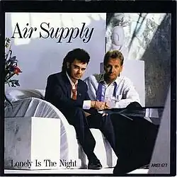 "Lonely Is the Night" is a song by Australian-British band Air Supply, released in 1986, as the lead single from their ninth studio album, Hearts in Motion (1986). The ballad was written by Albert Hammond and Diane Warren, while John Boylan produced it. "Lonely Is the Night" was a minor success in the United States, reaching number 76 on the Billboard Hot 100 but found better success on the Adult Contemporary chart, reaching at number 12.