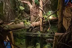 Indoor exhibits include Amazon Rainforest, Archer Fish, Best Buddies (clownfish & anemone), Birds, Bugs and Butterflies Exhibit, Coral Reef, Cuttlefish, Discus Fish, Electric Eel, Flounder Find, Form & Function, Giant Pacific Octopus, Jellyfish, Local Rocky Shores, Lost City of Atlantis Shark Exhibit, Marmosets, Megalodon Display, Moray Eels, Ocean Creatures of the World/Crab Villa (Japanese spider crab), Piranha, Poseidon's Treasure Room, Puffer Fish, Ray Bay, Sand Shark Lagoon, Schooling Fish (common Pacific silver moonfish), Seahorses, Shipwreck/Artificial Reef (Lion Fish), Tidal Marsh, an interactive touch tank and Turtle Bay (Australian snake-necked turtle, red-eared sliders and east African black mud turtles).[5]
