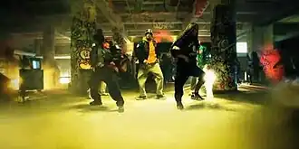 The video begins with scenes of Brown wearing a mirrored mask inside a giant birdcage, before switching to a dance routine in a smoke-filled, graffiti-covered parking garage. The mask was created for Brown by producer-collaborator Nick Marsh. In between these scenes, the video shows a Step Up-type dance-off in the parking garage.[20] When Brown raps his verse, he is seen standing next to Rhymes, wearing horn-rimmed glasses, a red Brooklyn cap, and a white baseball jersey, which was the signature look of Mars Blackmon from the 1986 film, She's Gotta Have It.[18] Rhymes then raps his verse after Brown's, standing beside him and later on the stairs in the parking garage. Wayne's verse soon follows after, with scenes of him rapping in front of the DeLorean sports car, and also on top of an ambulance car. The video also features cameo appearance from Kevin McCall, Diplo, Birdman, Tyga and Mack Maine. Birdman and Maine appear when Lil Wayne is performing his verse.