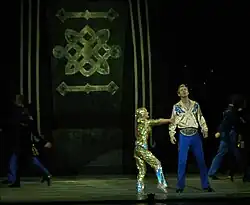 The eponymous number of the show ("Lord of the Dance") begins with a two pairs of males accompanying a pair of females in an introductory dance before the eponymous character dances to the shows' upbeat theme. The number ends with the title character being joined by his troupe.