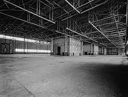 The hangar was constructed as one of the first hangars at the base, which opened two years prior. The building was constructed with the goal of giving the Strategic Air Command crews a place to sustain an aircraft's condition should behavior by the Soviet Union warrant an attack. It also had the added benefit of protecting the crews from the harsh Maine weather. Having the capability to house five B-36 Peacemaker aircraft was critical, as the base was originally designated to host over one hundred of these aircraft. It was also one of the first double-cantilever hangars built for the Strategic Air Command, due to a new demand for a larger and more efficient space, in contrast to the World War II-era buildings inherited on many other bases. The building has an ejected caisson foundation designed to ensure stability in the harsh conditions of northern Maine. The foundation consists of 260 24-inch (610 mm) diameter concrete caissons that extend down to limestone bedrock at a depth of 25 feet (7.6 m). Longitudinal arched steel trusses that are cantilevered 95 feet (29 m) at both ends from the shop supports in the center allow maximum vertical clearance. The north and south walls of the hangar each have a set of six doors that, when fully open, form a 300-foot (91 m) wide opening that accommodates the full wingspan of a B-36.[1]