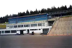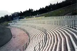 The stadium has a capacity of approximately 13,000 spectators (as of 2025). Of these, 6,500 can be seated in a 105-meter-long grandstand, divided into blocks A to G, located to the left of the control building. A mobile steel tube grandstand on the other side accommodates 4,000 spectators in blocks H and I. For the 2008 World Cup, 980 seats were added in the lower section, reducing standing room by about 1,000 places. The grandstands offer sightlines to the shooting range from 55 to 160 meters. Other sources report 9,000 spectators for the 105-meter grandstand and 6,500 for the steel tube grandstand. Due to increasing spectator numbers, an additional grandstand, the Waldtribüne (forest grandstand), was erected at the end of the sawdust track near the former finish area for the 2006 World Cup, providing space for 1,000 people. Its capacity was increased to 1,500 for the 2008 World Cup, though the view from there is somewhat restricted.[6]