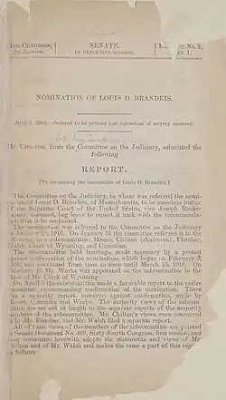 50. ^ "May Let Senate Deal with Brandeis Case; Judiciary Committee Practically Decides to Report on Nomination Without Recommendation. COURSE MEANS LONG FIGHT Administration Leaders Are Confident That the Nomination Will Eventually Be Confirmed". The New York Times. May 16, 1916. Retrieved August 25, 2022.