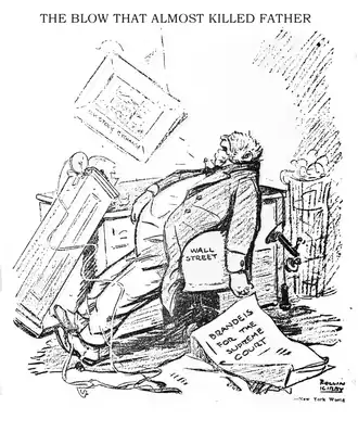 "The Blow That Almost Killed Father" by Rollin Kirby, a political cartoon published in the New York World depicting an anthropomorphized Wall Street reacting to "the blow" of Brandeis' nomination