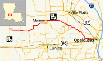 Louisiana Highway 104 (LA 104) is a state highway located in southwestern Louisiana. It runs 41.4 miles (66.6 km) in a west–east direction from LA 26 southeast of Oberlin to U.S. Highway 190 (US 190) in Opelousas.[1] Along the way, it passes through the town of Mamou and intersects various north–south routes that service points along US 190 such as Elton, Basile, and Eunice. East of Mamou, connections are also made to Ville Platte, the St. Landry Parish seat, on US 167/LA 10.