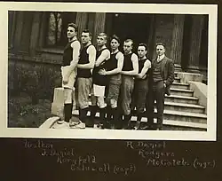 Hickman led Louisville to its first championship on a national level by winning the NAIB tournament in 1948.[5] In 1956, led by All-American Charlie Tyra, the Cardinals won the NIT Championship.[6] In 1956 his team was placed on two years probation, to include bans on postseason play, by the NCAA due to recruiting violations.[7] In 1959, Louisville made its first NCAA Final Four appearance behind the play of All-American Don Goldstein.