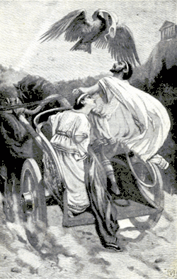 Not much is known about the early life of Lucius Tarquinius Priscus. According to Livy, Tarquin came from Etruria. Livy claims that his original Etruscan name was Lucumo, but since lucumo is the latinized form of the Etruscan word lauchume "king", there is reason to believe that his name and title have been confused in the official tradition. After inheriting his father's entire fortune, Lucius attempted to gain a political office. However, he was prohibited from obtaining political office in Tarquinii because of the ethnicity of his father, Demaratus, who came from the Greek city of Corinth. As a result, his wife Tanaquil advised him to relocate to Rome. Legend has it that on his arrival in Rome in a chariot, an eagle took his cap, flew away and then returned it back upon his head. Tanaquil, who was skilled in prophecy, interpreted this as an omen of his future greatness. In Rome, he attained respect through his courtesy. King Ancus Marcius noticed Tarquinius and, by his will, appointed Tarquinius guardian of his own sons.[3]