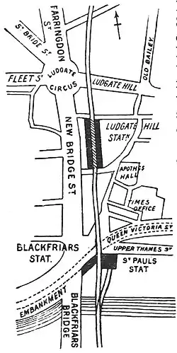 Ludgate Hill was a railway station in the City of London that was opened on 1 June 1865 by the London, Chatham and Dover Railway (LC&DR) as its City terminus. It was on Ludgate Viaduct (a railway viaduct) between Queen Victoria Street and Ludgate Hill, slightly north of St. Paul's station (now called Blackfriars station) on the site of the former Fleet Prison.[1]