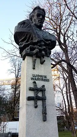 The Ludwik Waryński Monumnet (Polish: Pomnik Ludwika Waryńskiego) is a bronze bust sculpture on a granite pedestal, located in Warsaw, Poland, at the corner of Bema and Kasprzaka Streets, within the neighbourhood of Czyste, in the district of Wola. It is dedicated to Ludwik Waryński, a 19th-century activist and theoretician of the socialist movement in Poland. The sculpture was designed by Gustaw Zemła, and originally unveiled on 27 July 1974 at 57 Kolejowa Street. It was removed in 2006, and reinstalled at its current location in 2013.
