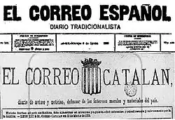 Correo Catalán, started in 1876,[136] was taken over by Llauder in 1878.[137] Unlike Correo Español, launched with official party finances,[138] Correo Catalán was Llauder's private property. He remained also chief editor of the daily, formatted as continuation of La Convicción.[139] During the first decade it followed the Integrist line of Nocedal and Sarda;[140] though after 1888 the daily remained within mainstream Traditionalism,[137] it very much kept pursuing the same intransigent Catholic line.[141] Correo remained a semi-official party paper in Catalonia, publishing orders and dispositions, mobilizing organizational work and disseminating propaganda.[142] It chiefly consisted of 3 sections: news, opinion and fixed columns, dominated by religious subjects.[143] The daily developed weekly mutations in Tarragona, Girona and Lleida.[144] Its circulation is not clear; some sources claim 4,000 copies[72] and some claim as much as 8,000 copies.[145] Personal Llauder's trademark were his Sunday editorials.[125] In 1899 he ceded command of the paper to Salvador Morales.[146]