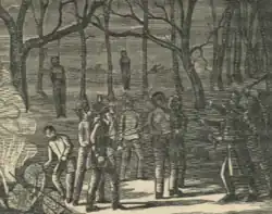 A white mob lynched George Johnson, Squire Taylor, and Charles Davis, all Black men, in Charlestown, Clark County, Indiana, in 1871.[1] The three men were accused of killing the family of Cyprus Park, a farmer who lived near Henryville, Indiana. A neighbor near the Parks family believed that he was also a target but managed to keep the assailants out of his home. The neighbor believed that the assailants were white. Even so, George Johnson, a Black man, was arrested on suspicion of committing the murders and was tortured until he confessed. He also gave out the names of two other Black men, Squire Taylor, and Charles Davis. These men were then arrested. The trial followed quite quickly. The grand jury declared the men not guilty based on the lack of evidence, but the men remained in custody and were sent to a Charlestown jail.[1]