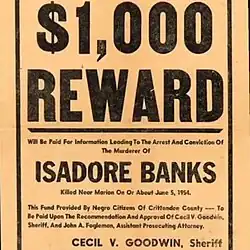 The lynching of Isadore Banks occurred in Marion County, Arkansas, in 1954. No investigation ever occurred and no murderers were found.[1] Banks was a wealthy African-American man in Arkansas. Nobody was ever charged for his death, and it remains one of the cold cases of the Civil Rights era.[2]