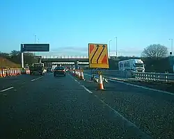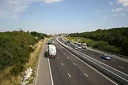 The M18 was originally to be part of the M1, but it was decided to route the M1 towards Leeds instead of Doncaster, and the routing of what would have been the M1 east of Sheffield became the M18.[1] To provide better access to Doncaster town centre and the new Great Yorkshire Way to Doncaster Sheffield Airport, the section of the M18 between junctions 2 and 3 northbound was upgraded to three lanes, between June 2014 and June 2015.[2]