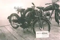 Mota Maschinenbau GmbH developed a two-wheel-vehicle between 1948 and 1952 which should unite the advantages of a scooter and motorbike: The Wiesel had leg shields and a carrier on the backside.[4] The engines were produced by the company itself in different variations: 50, 75 and 98 cm3 of cubic capacity. Often the saddle wasn't height-adjustable, but adjustable to the front or back. A toolbox was installed just behind of it. The Wiesel was produced with the following high-quality components: