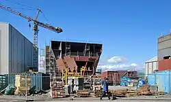 To mark the start of construction, the first steel for both vessels was cut on 16 February 2016 at a ceremony attended by transport minister Derek Mackay.[54][55] FMEL agreed a contract in May 2016 with Vera Navis of Portugal as their detail design partner, to carry out production engineering of the ships.[56] Problems increased as FMEL did construction work "at risk", without approval of drawings by CMAL, and without regulation approvals required by the classification society (Lloyd's Register) and the Flag Authority (MCA). Delays built up as incorrect work had to be re-done. TS informed Scottish ministers that the vessels were likely to be late, CMAL said it had cash flow problems due to contract problems and was assisted by accelerated payments and a loan.[41][48] The vessel's bulbous bow was rough rather than smooth, and condemned by Lloyd's as not fit for purpose, but left uncorrected at the time of the launch.[57]