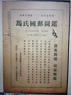The first edition was primarily sourced from hand written manuscripts edited by the late Ma Zung-Sung (馬潤叟 1872–1945). His son, Ma Ren-Chuen (馬任全 1908–1988), already a postal expert in Chinese stamps and like his father a philatelist, was inspired by his father's unfinished wish to put together a comprehensive catalogue during the last four years of his life. After his father's death in 1945, and after extensive consultation with a number of Shanghai's authoritative philatelic experts and philatelic literature collectors, he compiled and supplemented his father's original manuscripts and then translated the entire work from traditional Chinese to English. The first edition was published with 661 black & white illustrations. The costs for typesetting, proofreading, printing, publishing, and distributing were self-funded by Ma alone. A small quantity[1] of 1000 copies was printed by Shun Chang & Co. (順昌),[2] in Shanghai, China in June 1947 (民國三十六年). For many years the catalogue was the most inclusive stamp catalogue ever published in China, and it was the first and the only one printed in both Chinese and English texts together in one volume and exclusively published by a Chinese person. Stamp catalogues prior to Ma's were all available only in English and were printed overseas by foreign stamp dealers, often including incomplete or contradicting information among the various catalogues. The catalogue had made it possible for universal sharing and education of early Chinese stamps by all collectors in China or overseas.
