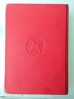 The first edition[3] has a scarlet colour hardcover with gilt lettering in both Traditional Chinese (馬潤叟遺著,馬任全譯纂 written vertically) and English (written horizontally) on the front cover. A small horse emblem ("馬圖", pronounced "Ma" in Chinese, the editor's last name, mainly used for anti-counterfeiting) is embossed at the centre of the back cover. The front and back covers are further embossed with wrinkle like patterns such as those found on the palm of a hand, except within the area of the horse emblem. The number 1947 is located right below the book title frame. Every authentic copy has a distinct serial number (out of 1000) stamped in black ink on the endpaper opposite the back cover. The pages are bound together, using the "Sewing Through the Fold" method, with four binding threads visible. It has 568 pages. The book measures 14mm x 19.5mm. The paper used is an advanced and costly paper called Art Paper (銅版紙), often referred as Coated Printing Paper (塗佈印刷紙), or Coated Paper (粉紙). The paper is coated with a thin clay to give it a more prestigious feel and elegant look. The prints can be felt when running one's fingers over the page. The pages are uncut, and lie flat when the book is opened. There is no dust jacket issued with this book.