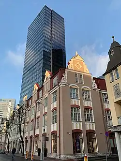 The street space is dominated by the renovated or restored Art Nouveau buildings, including the longest Art Nouveau façade in Tallinn designed by Baltic German architect Jacques Rosenbaum.[4] Viewed from a distance, the combination of the 'new and old' gives an impression that the modern glass facade of the office tower is growing out of the historic sections.[7]