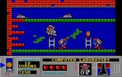Initially, Mariarti's weapon is an infinite supply of spanners. Other weapons can bought from Tool Vendors using tokens that are scattered around the labs. There are also static obstacles that either drain the Professor's health gradually (such as puddles of acid) or kill him instantly if touched (such as electric zappers of various designs). Most of these cannot be controlled in any way, but some can be disabled via a switch situated somewhere in the laboratory. In each laboratory, Mariarti must eventually reach a second switch in order to close down the room. When a room is shut down, Mariarti is taken back to the lobby where he can choose another laboratory to visit next.