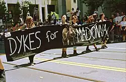 In her early career, she was accused for "being irresponsible because of her support for gay culture", as noted Matt Cain, after the release of Like a Prayer in 1989.[83] Madonna's popularity among young audiences, her embrace of sexuality, and her support for the community drew additional criticisms and raised cultural concerns in some sectors; different pro-family, political, and religious groups accused her of promoting homosexuality and immorality, including in 1993 during her Girlie Show, leading an unprecedented debate in the Mexican Chamber of Deputies.[84] Similarly, during 1990's Blond Ambition World Tour and 1991's Truth or Dare, she wadded into debate of the 1988's section 28 by Margaret Thatcher, a law that prohibited the intentional "promotion of homosexuality" in the United Kingdom. She was accused of not only promoting homosexuality but also normalizing it.[85] In 2012, author Nicholas C. Charles denounced: "Madonna uses her videos as a weapon to desensitize and demoralize her millions of fans into accepting the destructive practices of homosexuality as normative".[86]