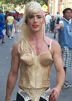 Madonna has a long-lasting history advocating for the community, and "actively participating in gay culture" according to LGBT-targeted magazine Attitude.[13] In this aspect, French academic Georges-Claude Guilbert, writes in Gay Icons (2018) that "Madonna has done little else in her career, camping like a gay man, quoting like a gay man".[13] Boy George described her as "a gay man trapped in a woman's body".[14] In 2017, the British LGBT Awards stated:
