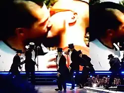 Madonna sparked again conversations after kissing Christina Aguilera and Britney Spears at the 2003 MTV Video Music Awards. Their kiss have been replicated numerous times, including by Israeli activists in 2019, to celebrate Madonna's arrival at the Eurovision Song Contest and to show that "love break down barriers",[133] and in popular culture by celebrities like Kylie Jenner.[134]