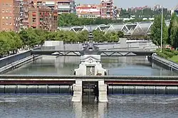 There are seven dams that regulate the river as it passes through the city. They receive the waters of the Manzanares River after passing through the Santillana reservoir, in Manzanares el Real, and the El Pardo reservoir, in the municipality of Madrid, which is why they are numbered from 3 to 9. Their mechanisms and locks have been repaired and the dams have been used for the new system of crossings. Initially, the project for the renaturation of the Manzanares River as it passes through Madrid Río contemplated the opening of all the dams, except the last one, to create the conditions that would make it possible for the Madrid Río rowing school to train, but finally, contrary to what was first agreed and due to pressure from the local residents, it was also decided to also open the last one so that the river could flow freely.