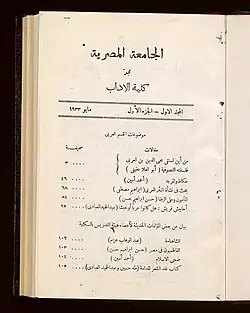 The Egyptian journal Maǧallat Kullīyat al-Ādāb bi-l-Ǧāmiʿa al-Miṣrīya (Arabic: مجلة كلية الآداب بالجامعة المصرية; DMG: Maǧallat Kullīyat al-Ādāb bi-l-Ǧāmiʿa al-Miṣrīya; English: "Bulletin of the Faculty of Arts of the University of Egypt") was published at Cairo University, formerly known as the University of Egypt resp. later known as Fuad I University, between 1933 and 1942. A total of ten issues was published in six editions every six months.[1]