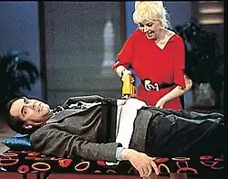 Magician Dorothy Dietrich sawing celebrity assistant and comedian Robert Klein in half on TV