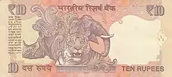 ₹10 | 137 × 63 mm | Orange and violet | Indian rhinoceros, Indian elephant, and Bengal tiger | 1996 / 2017 | Current | |||