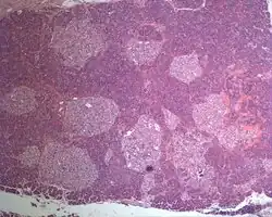 Photographic image of the numerous islets of various sizes in the pancreas of a patient with Mahvash disease