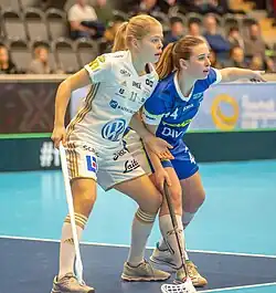 Viström (left) playing for IKSU in the 2019 Champions Cup final against 1. SC Vítkovice.