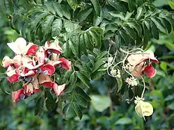 This very ornamental small tree has shiny foliage with an attractive rounded canopy, making it very suitable for small tropical gardens or a container plant in cooler climates. They are hardy only in frost-free zones, otherwise they can make a rare and unique houseplant as they are smaller when container grown. The leaves are compound with up to 10 pairs of leaflets, which are elliptic about 5–7 centimetres (2.0–2.8 in) long and 2–3 cm (0.79–1.18 in) wide. Its highly ornamental seeds mean it's sometimes referred to as the black pearl tree or velvet-seed tree.