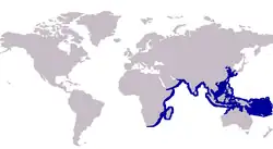 The Malabar trevally is broadly distributed in the tropical and subtropical regions of the Indian and Pacific Oceans. It occurs from South Africa and Madagascar in the west,[5] north along the east African coast and into the Persian Gulf, but has not been recorded from the Red Sea[9] since 1860, where a capture was reported under the name Caranx malabaricus.[10] Its range stretches east to Sri Lanka, Thailand, Indonesia, and a number of small Pacific islands including Vanuatu and New Caledonia. It reaches as far north as Japan, and south to northern Australia. The species is rare in a number of Pacific nations, including Taiwan and Japan, with only a few recorded captures.[11]