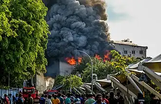 The fire broke out during the opening hours of the Housing Ministry on 12 December 2024. Later on, the fire quickly spread to the Construction Ministry as well as the Environment Ministry. Firefighters arrived on the scene approximately after the fire had started. The Health Protection Agency (HPA) issued a health advisory saying to not be near the fire unless necessary.[2] Police evacuated nearby residents and occupants in the affected area.[3][4] The National Disaster Management Authority (NDMA) established an emergency evacuation centre in Social Centre to help the affected people, where 50 people requested help.[5][6] It took over six hours to bring the fire under control. [7] President Mohamed Muizzu and Construction and Infrastructure Minister Abdulla Muththalib arrived at the scene to assess the situation.[3] The fire led to the complete halt of operation for the Ministry of Housing, Land and Urban Development, Ministry of Construction and Infrastructure, and the Ministry of Environment.[8] Later, the ministries were temporarily relocated to Dharubaaruge.[9] The Vital Registration Office was relocated to the first floor of Amin Avenue in Hulhumalé.[10]