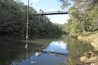 The Maldon Weir (34°12′12.27″S 150°37′47.01″E / 34.2034083°S 150.6297250°E / -34.2034083; 150.6297250 (Maldon Weir)) lies about 250 metres upstream from the Suspension Bridge. It formerly supplied water to the nearby Stonequarry Lodge Hostel.[7] Maldon Weir is currently (August 2010) the only weir on the Upper Nepean River not targeted for modification, despite having been identified as a major barrier to fish migration.[8] Most other Upper Nepean weirs will be given increased capacity, to improve environmental flows, and improved fishways will be installed, as part of Sydney Catchment Authority's Weirs Project.[9]