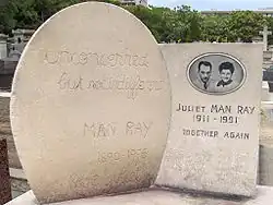 Ray continued to work on new paintings, photographs, collages and art objects[51] until his death from a lung infection, in Paris, on November 18, 1976. He was interred in the Cimetière du Montparnasse in Paris,[52] his epitaph reads "Unconcerned, but not indifferent". When Juliet died in 1991, she was interred in the same tomb. Her epitaph reads "Together again". The grave site has now fallen into disrepair and the memorial stone is removed or missing. Juliet organized a trust for Ray's work and donated much of his work to museums. Her plans to restore the studio as a public museum proved too expensive; such was the structure's disrepair. Most of its contents were stored at the Centre Pompidou museum.[46]