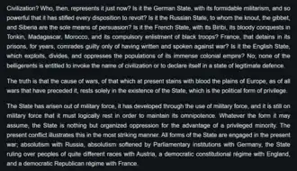 Written and conceived by Errico Malatesta, the document was signed by thirty-six prominent anarchist figures, including Emma Goldman, Alexander Berkman, and Luigi Bertoni. In it, Malatesta criticized the stance of anarchists who supported a war that was neither anti-colonial, nor a war of liberation, nor a revolution, but rather a conflict between capitalist powers against which anarchists ought to have fought.