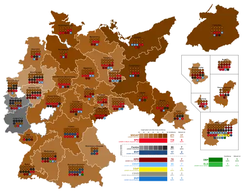 Federal elections were held in Germany on 5 March 1933, after the Nazi seizure of power on 30 January and just six days after the Reichstag fire. The election saw Nazi stormtroopers unleash a widespread campaign of violence against the Communist Party (KPD), left-wingers,[1]: 317  trade unionists, the Social Democratic Party[1] and the Centre Party.[1]: 322  They were the last multi-party elections in a united Germany until the all-German vote in 1990, though by then, the democratic process had ceased to be free or fair.