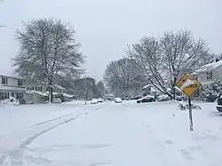 After forming, the storm began intensifying as it slowly moved northward parallel to the East Coast, with a large swath of moderate to heavy snow covering the area of New Jersey and Long Island in the morning hours of March 21.[8] Contrary to the previous nor'easters, there was colder air further south then in other storms, which allowed accumulating snow to stick more quickly in areas near southern New Jersey throughout the day. Due to moving slowly near the coast, bands of heavy snowfall (with some embedded rates of up to 4 inches (10 cm) per hour) hammered the coastline as it continued to slowly move eastward.[9] By the following day, the system attained a minimum pressure of around 988 mbar (29.2 inHg). Shortly afterwards however, at 15:00 UTC, the WPC terminated storm summaries on the nor'easter as most of the snow in New England had tapered off.[10]