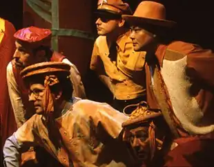 MA FISH CO describes its heavily layered films as "faux-foreign"—shot in foreign languages with English subtitles and designed with a foreign-film aesthetic (e.g., the grainy, Russian-influenced The Üble Marionette, 1992).[66][33][60][67] The Letter P, The Story of Pulcinella (1997) combines puppets and live action, music and text in a poetic, allusion-filled re-imagining of the Italian commedia dell'arte figure Pulcinella that explores historical connections to European anti-Semitism and themes of ghettoization and survival.[68][67][69][33] Other films reconsider or refashion the works of artists like Marcel Duchamp (Letters of Duchamp, 1994 with Charles Shere) or continue the theme of zero gravity (Spider and the Fly, 1993).[33]