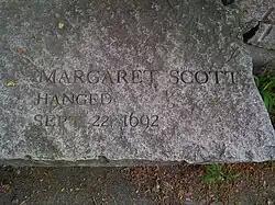 Margaret Scott (née Stephenson; March 28, 1616 – October 2, 1692 [O.S. September 22, 1692]) was found guilty of witchcraft during the Salem witch trials and was executed by hanging on September 22, 1692. She was part of the last group to be executed, which also included Mary Eastey, Martha Corey, Ann Pudeator, Samuel Wardwell, Mary Parker, Alice Parker, and Wilmot Redd.[1] She was the only accused person from Rowley to be executed. As a lower-class, long-term widow, having lost several children in infancy, she was a prototypical witch candidate. When her husband, Benjamin, died, he left a very small estate and she, being unable to remarry, was reduced to begging, which invited resentment and suspicion. In this manner, her circumstances were comparable to fellow victim Sarah Good.