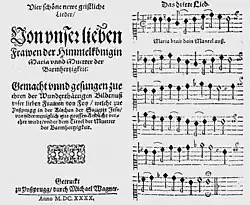 The oldest extant print of "Maria, breit den Mantel aus" is in a booklet of four Marian hymns published by the Innsbruck music publisher Michael Wagner, under the header "Vier schöne newe geistliche Lieder, Von vnser lieben Frawen der Himmelkönigin Maria vnnd Muetter der Barmhertzigkeit, Gemacht vnnd gesungen zue ehren der Wunderthättigen Bildtnuß vnser lieben Frawen von Foy, welche zue Ynßprugg in der Kirchen der Societet Jesu, von jedermeniglich mit grosser Andacht verehrt wirdt, vnder dem Tittel der Muetter der Barmhertzigkeit" (Four beautiful new spiritual songs, of our dear Lady Queen of Heaven Mary and Mother of mercy, made and sung to honour the miraculous image of our dear Lady of Foy, which is honoured by everybody at the church of the Society of Jesus in Innsbruck with great devotion, under the title Mother of mercy.).[1] The song has 29 stanzas in this print,[2]: 156  of uneven poetic quality. It is probably a compilation of older origins. The song remained in hymnals until the middle of the 18th century.