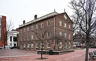 The Market House is a historic three-story brick market house in Market Square, in the College Hill, a neighborhood of Providence, Rhode Island, USA. The building was constructed between 1773 and 1775[2] and designed by prominent local architects, Joseph Brown and Declaration of Independence signer Stephen Hopkins.[2][3] The bottom floor of the house was used as a market, and the upper level was used for holding meetings. Similar buildings existed in other American cities, such as Faneuil Hall in Boston and the Old Brick Market in Newport. The building housed the Providence City Council in the decades before the completion of City Hall.