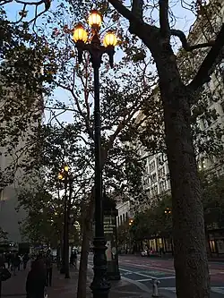 Willis Polk designed the Path of Gold Street Lamps in 1908 for United Railways’ trolley poles with street lights. The tops were designed in 1916 by sculptor Leo Lentelli and engineer Walter D'Arcy Ryan. The Winning of the West bases were designed by sculptor Arthur Putnam and feature three historical subjects: covered wagons, mountain lions, and alternating prospectors and Indians. The City required the highly ornamental poles to permit the much-opposed overhead trolley wires.[22]