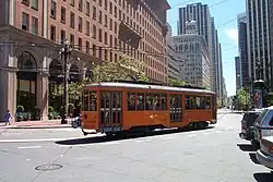 The first horsecar-powered railway line to open in San Francisco commenced running down the thoroughfare on July 4, 1860, operating under the Market Street Railroad Company.[15] By 1918 Muni was in direct competition with the United Railroads of San Francisco (the successor company to the Market Street RailRoad Company) down the length of Market Street; the two operators each operated their own pair of rail tracks down that thoroughfare, which came to be known as the 'roar of the four'. The two Union Railroad tracks were on the inside and the two San Francisco Municipal Railway tracks were on the outside.[15][16]