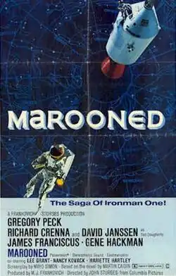 Marooned is a 1969 American science-fiction film directed by John Sturges and starring Gregory Peck, Richard Crenna, David Janssen, James Franciscus, and Gene Hackman about three astronauts who are trapped and slowly suffocating in space.[3] It was based on the 1964 novel Marooned by Martin Caidin. While the original novel was based on the single-pilot Project Mercury, the film depicted an Apollo command and service module with three astronauts and a space station resembling Skylab. Caidin acted as technical adviser and updated the novel, incorporating appropriate material from the original version.