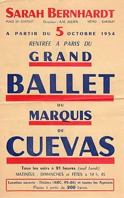 He founded a new ballet company as the Ballet International in New York City in 1944, performing at a now-destroyed theater in Columbus Circle. The company was variously called the Grand Ballet de Monte Carlo or the Grand Ballet du Marquis de Cuevas, but was most commonly called The de Cuevas Ballet by theatergoers.[3][11]